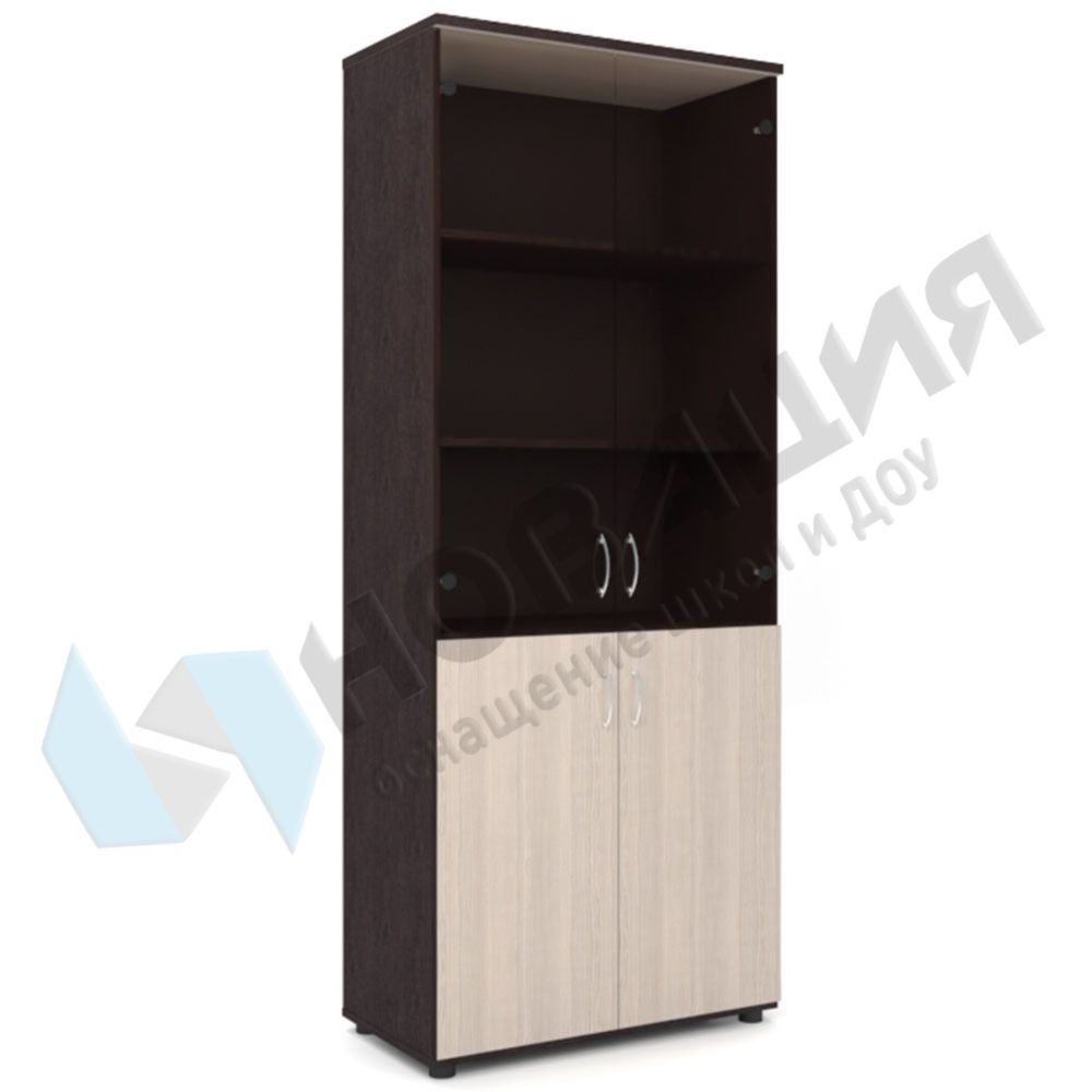Офисный шкаф  устанавливается в кабинетах, библиотеках, холлах ДОУ, школ, прочих муниципальных учреждений. Подходит для размещения научной  литературы, хранения методических пособий. Внутри 5 полок: 3 наверху, за стеклянными  дверцами; 2  внизу, за дверцами из ЛДСП. Среди плюсов данной модели  — наличие регулируемых опор, предусмотренных для компенсации неровностей пола.