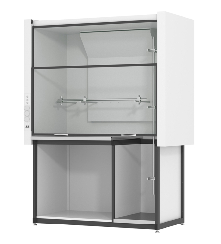 Шкаф оснащен подъемным механизмом, который позволяет установить защитный экран из бронированного стекла на любой высоте. Вытяжка происходит даже при опущенном экране за счет зазора для притока воздуха. Воздушный поток разделяется на две части для отбора тяжелых и легких газов из нижней и верхней части рабочей камеры шкафа.