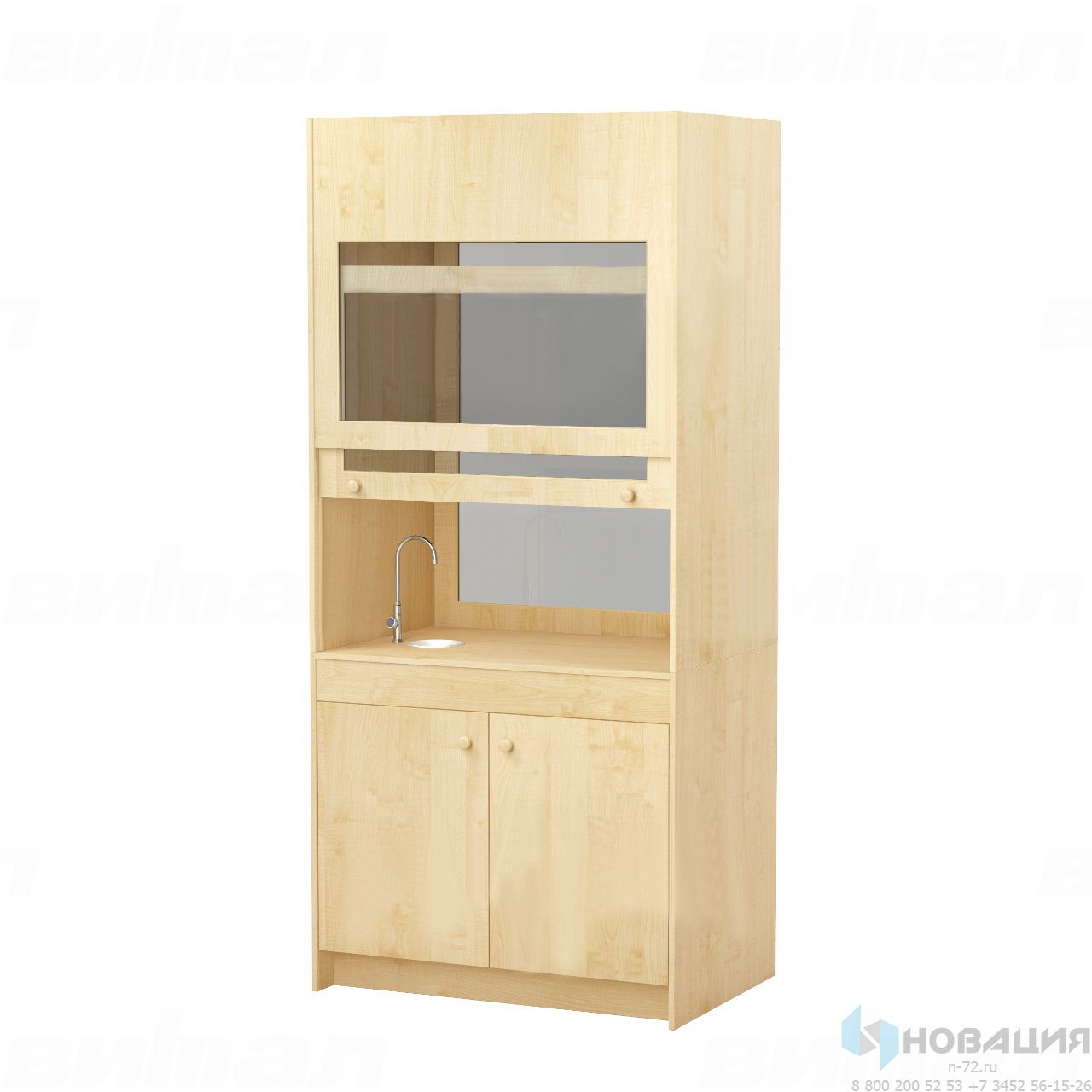 Вытяжной шкаф для школы оснащен водоразборной колонкой (краном), раковиной, тумбой с двумя дверцами и полкой внутри для хранения препаратов и инструментов. Используется в специализированных кабинетах, где проводятся лабораторные работы. Столешница изготовлена из ДСП с пластиковым покрытием, передний торец отделан противоударной кромкой.