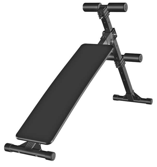 Наклонная скамья оснащается валиками для закрепления ступней ног. Торцевые опоры подстраиваются под неровности пола. Угол наклона тренажера изменяется в пределах: 15, 25, 35 градусов.