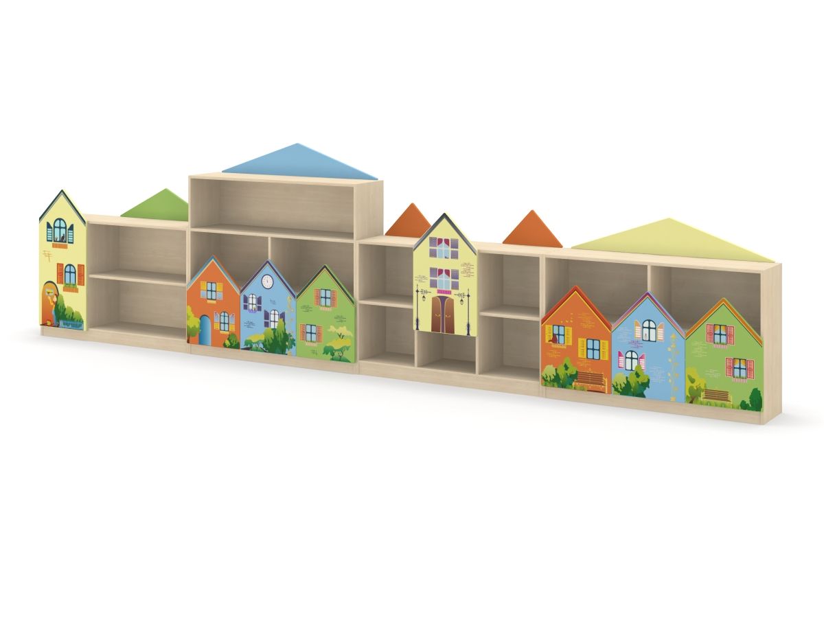 Стеллаж для игрушек и пособий декорирован изображениями городских домов. 4 секции состоят из верхних и нижних отделений полуоткрытого и закрытого типа. Вместительные полки комплектуются резными дверцами. Топ служит дополнительной поверхностью для хранения.