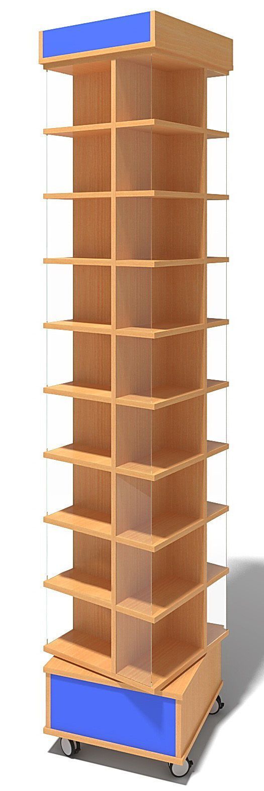 Конструкцию легко передвигать: основание мебели стоит на 4-х колесных опорах. В центральной части стеллажа 36 ячеек со стеклянными боковыми стенками. Витрина вращается.