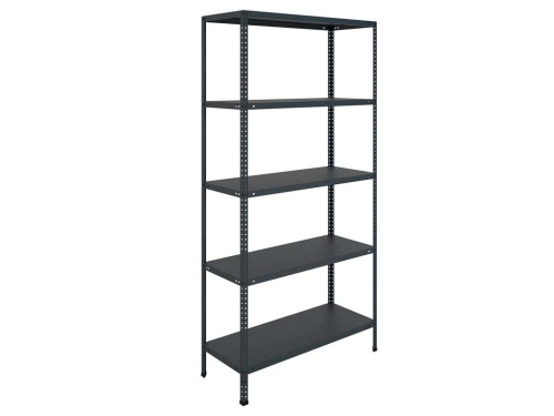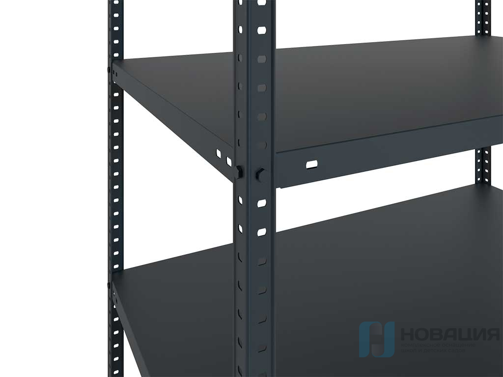 Универсальный стеллаж отличается прочностью и эстетичностью благодаря окраске в оттенок муар и чёрному цвету всех металлических элементов, включая Г-образные усилители конструкции и крепежные детали.