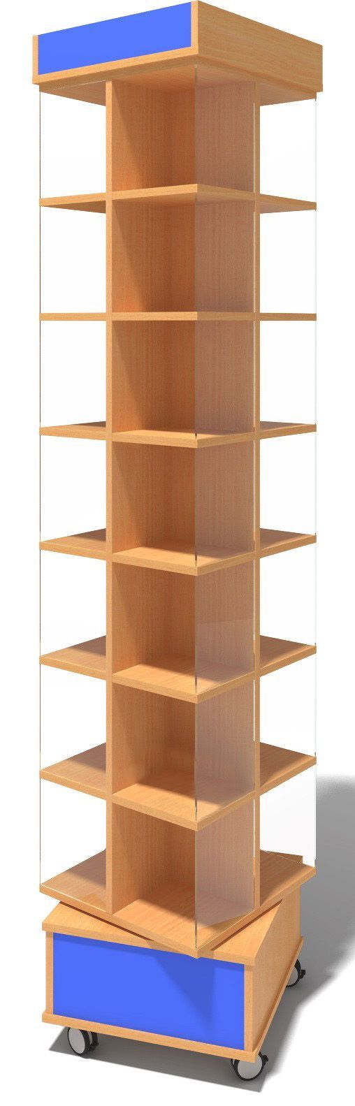 В центральной части стеллажа 28 отделений для брошюр, методических материалов, книг небольшого формата. Боковые стенки выполнены из стекла. Витрина вращается. Основание оснащено 4-мя колесными опорами, которые облегчают процесс перестановки.