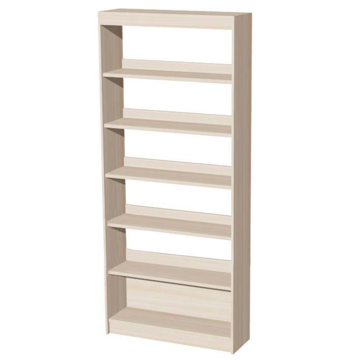 Стеллаж с цоколем украшается фризом, h 80 мм. Торцевая опора регулируется по высоте. На сквозных полках экземпляры удерживаются бортиками. Шкаф для книг выполняется из ЛДСП. Поверхности рекомендуется протирать влажной, а затем сухой тканью.