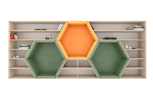 Книжный стеллаж оснащен тремя мягкими посадочными местами в форме сот. Обивка изготовлена из материала, который легко очищается от загрязнений. Стеллаж монтируется к стене, крепеж поставляется в комплекте.