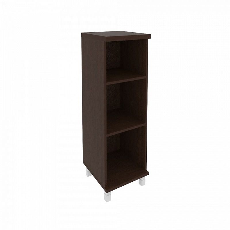 Узкий стеллаж средних размеров оснащается 3-мя полуоткрытыми отделениями с глухой задней стенкой. ЛДСП отделана кромкой (0,4 и 2 мм) в цвет мебели. Шкаф для бумаг стоит на высоких регулируемых опорах из металла.