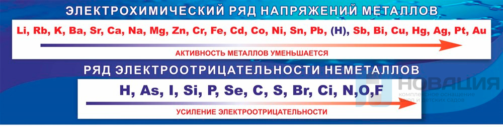 На стенде представлены электрохимический ряд напряжений металлов и ряд электроотрицательности неметаллов. Предназначен для того, чтобы школьники могли использовать его как наглядное пособие и обратиться к нему в любой момент.