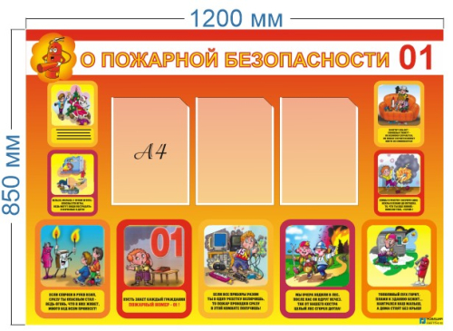 Стенд поможет обучить детей правильному обращению с огнем и электроприборами. На стенде изображены различные тематические картинки с советами о том, как следует вести себя в различных экстренных ситуациях, связанных с огнем и пожаром. В центре расположены три кармана формата А4, в которые можно поместить плакаты, рисунки, советы, важные объявления на тему пожарной безопасности. Карманы крепятся на двусторонний скотч.