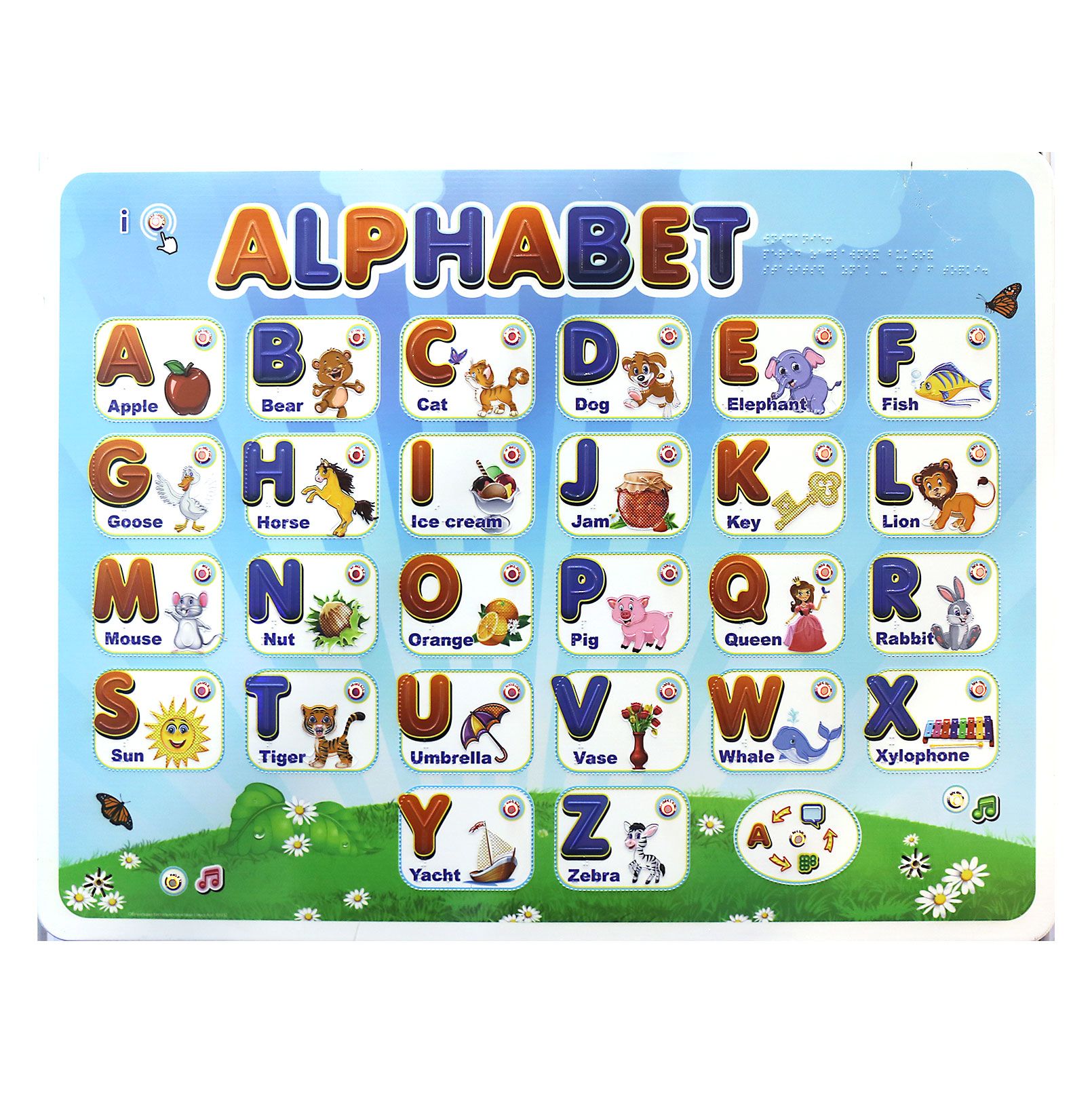Крупные изображения букв разделены тактильным пунктиром. Рядом размещено изображение объекта, название которого (на английском языке) начинается с данной буквы. Надписи дублируются на языке Брайля.