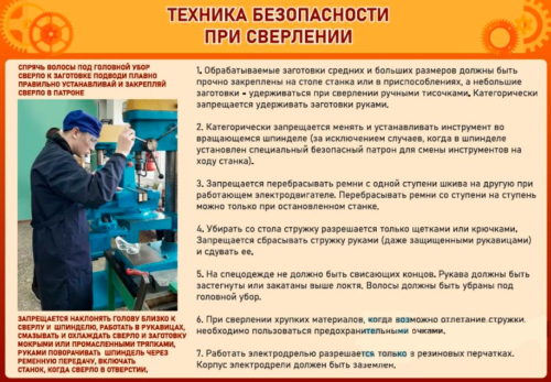 Перед началом практических занятий преподаватель обязан донести до учащихся все правила безопасного поведения при работах по сверлению. На стенде в развернутой форме описаны правила поведения у сверлильного станка, а также порядок действий при сверлении.