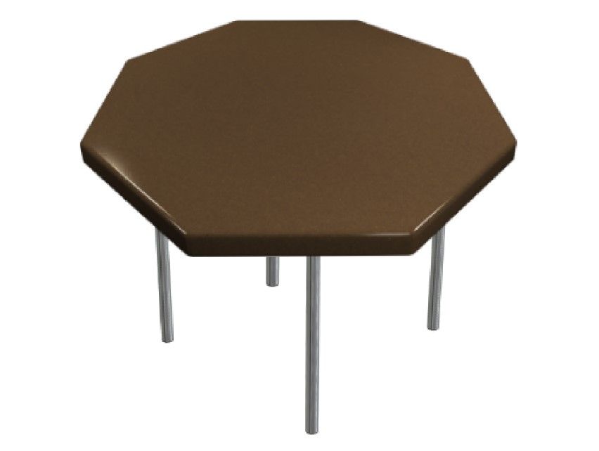 Мебель со столешницей в форме восьмигранника из акрилового камня размещается в столовой школы или иного муниципального учреждения, в обеденной зоне общежития. Все углы тщательно обработаны, стыки незаметны. Искусственный камень ненавязчиво смотрится в интерьере, придает обстановке более современный облик.