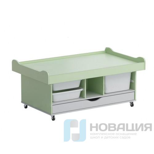 Конструкция стола состоит из крышки с радиусными бортиками, основания, горизонтальной стенки, средней стойки, двух боковин и четырех вертикальных стенок. В нижней части стола между основанием и горизонтальной стенкой установлен широкий ящик. В комплект также входят 4 низких лотка для хранений высотой 100 мм и 2 средних высотой 230 мм.