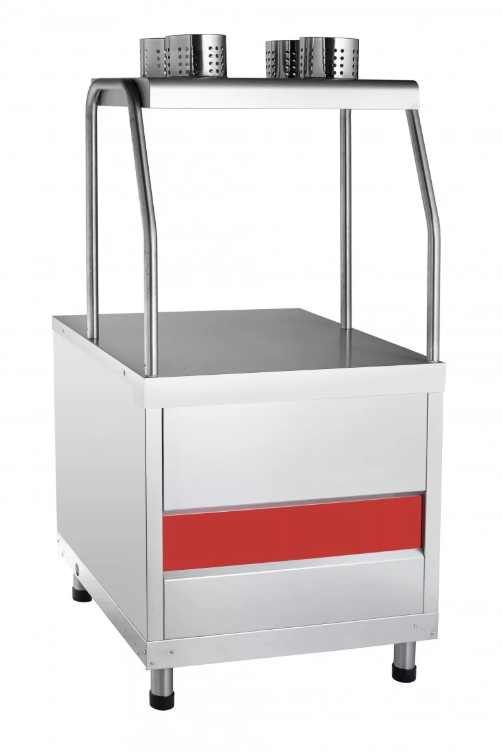 Стол для приборов и подносов — элемент линии раздачи, без которого не может обойтись ни одна столовая. Прилавок оснащен поверхностью, на которой удобно расположить подносы, а также 4-мя емкостями из нержавеющей стали, позволяющими хранить вилки, столовые и чайные ложки, ножи.