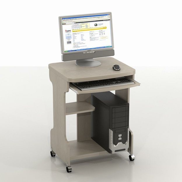Углы столешницы закругляются. Мебель для техники оборудуется 4-мя колесиками. Между фигурными боковыми стенками предусматривается 3 сквозных отделения. Вертикальный отсек подходит для системного блока. Другая половина пространства под столешницей делится на 2 части горизонтальной полочкой. Дополнительная полка для клавиатуры выезжает на роликовых направляющих.