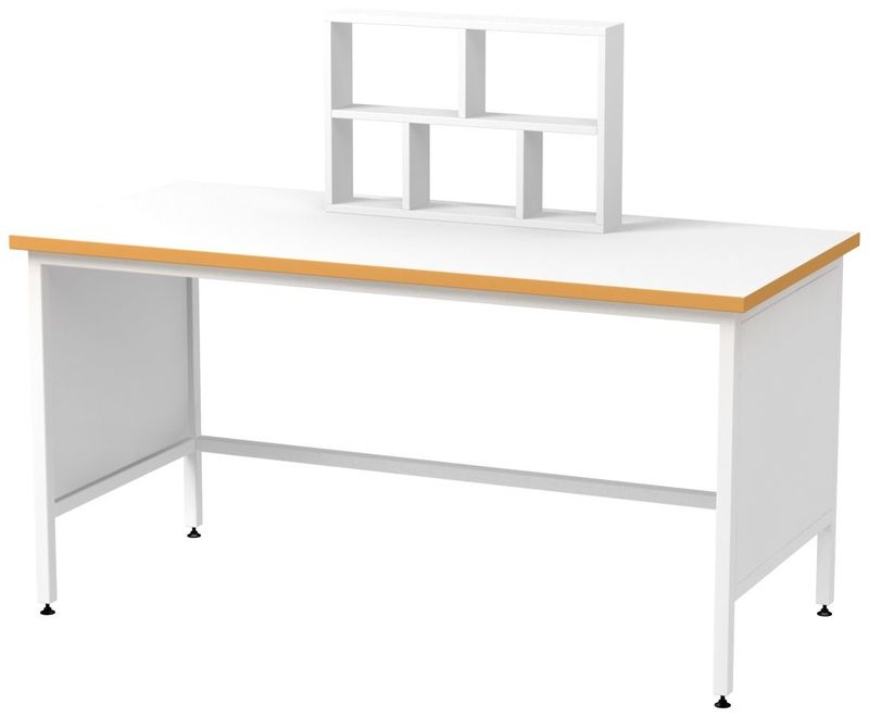 Столешница изготовлена из ламината (ДСП с термостойким пластиком). Поверхность готова к воздействию влаги и химических веществ. Рабочее место дополнено стеллажом со сквозными отделениями для чашек Петри.