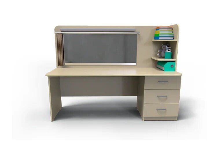 Тумба с подпятниками расположена справа под столешницей. Фасады оснащены фурнитурой. Дидактические материалы хранятся в ящиках или на полуоткрытых полках над столом.