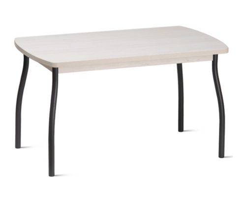 Столешница изготовлена из ЛДСП, края облицованы ПВХ-кромкой. Острые углы скруглены. Ножки выполнены из круглой стальной трубы и имеют выгнутую форму. Концы ножек оснащены пластиковыми заглушками.