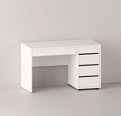 Основательная столешница закрепляется на 2-х монолитных опорах из панелей ЛДСП. Функциональный предмет мебели оформлен в стиле техно. Сдержанный дизайн стола настраивает на учебу, а прочность конструкции позволяет работать с техникой или бумажной литературой.