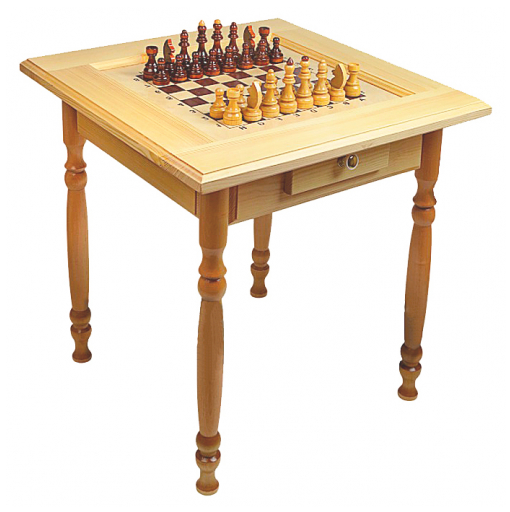 Изготовлен из дерева, тщательно отшлифован, покрыт лаком на водной основе. В центре столешницы выполнено углубление, в котором размещено поле с разметкой для игры (размер клетки 4,5 мм) в шахматы и шашки.