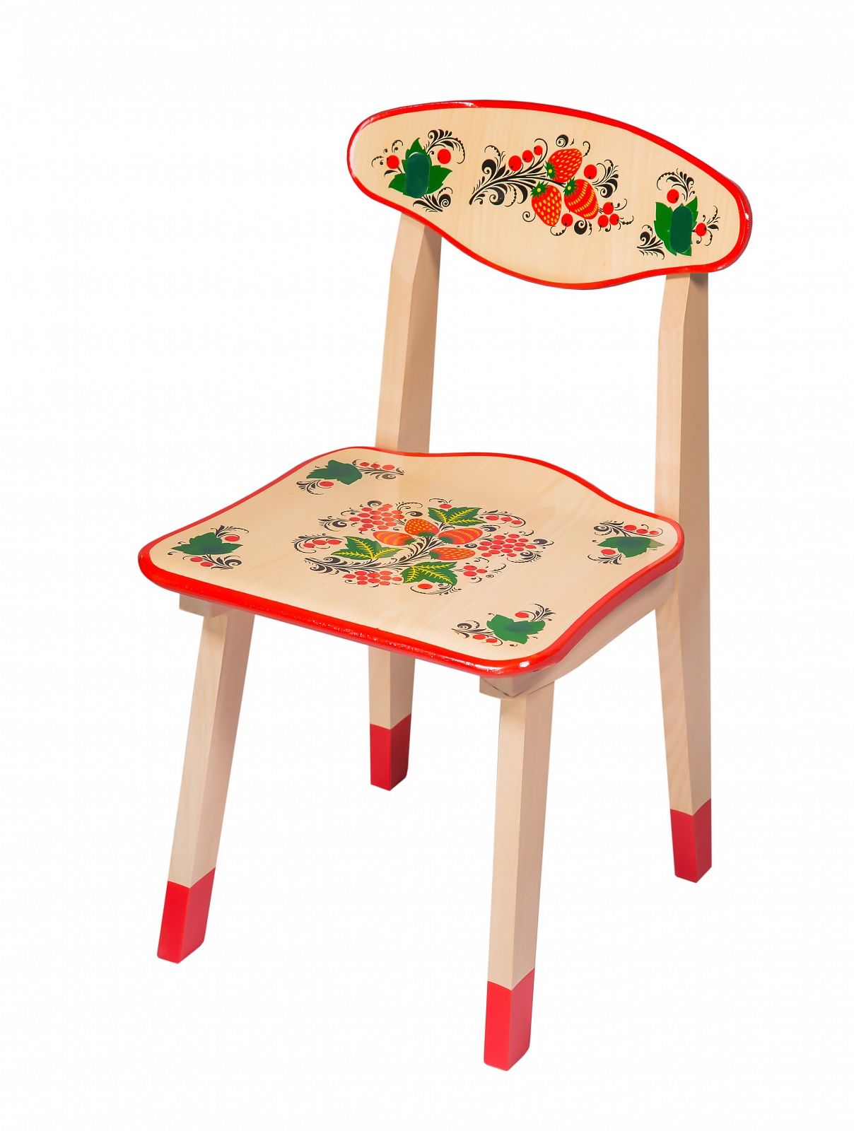 Стул детский с художественной росписью в стиле хохлома может использоваться для оснащения детских садов и других дошкольных учреждений. Выполнен из массива дерева, все углы закруглены, поверхность тщательно обработана, сверху покрыта бесцветным лаком.