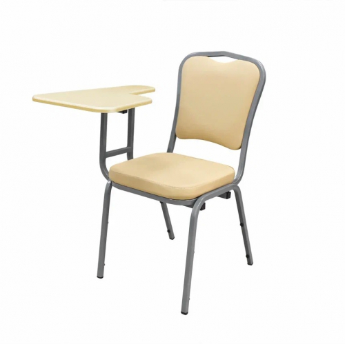 Стул без подлокотников оснащен высоким пюпитром без острых углов, который позволяет делать записи. Размещается на 4-х прочных стальных опорах, на концах которых есть заглушки. Толщина сиденья - 50 мм - обеспечивает дополнительный комфорт. Стул оснащен спинкой размером 350х350 мм.