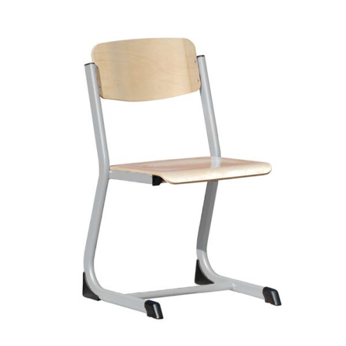 Ученический стул на опорах-полозьях оснащен квадратным сиденьем (ДхШ 380х380 мм) и эргономичной спинкой. При производстве учтены требования СанПиН: поддерживается средняя часть позвоночника, нет нагрузки на поясничный отдел. Передний край сиденья закруглен. Опоры-полозья с подпятниками и заглушками соединяются перекладиной. Углы наклона сиденья и спинки 3° и 100° соответственно.
