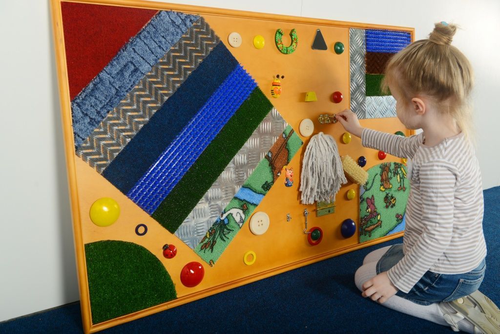 Панель предназначена для сенсорного развития. На поверхности закреплены различные тактильные элементы: колечки, пуговицы, замочки, искусственная трава, разноцветные круги и пр. С помощью тактильной панели дети научатся различать цвета и формы, описывать материал, к которому притрагиваются. Оптимальна для детей с ослабленным зрением.