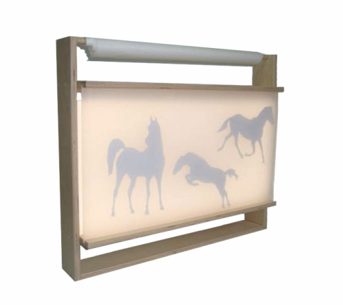 На стекле можно закреплять изображение, которое срисовывается с помощью кальки. Рулон крепится на деревянном стержне. Также на стекло можно наносить силуэты различных персонажей, которые вырезаны из бумаги, чтобы организовать театр теней.
