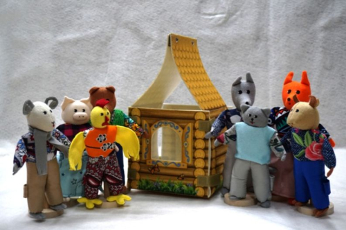 - 8 кукол: бык, поросенок, медведь, баран, петух, кот, лиса и волк.