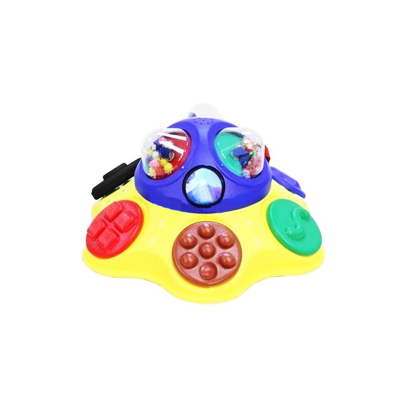 Ребенок вращает корпус устройства и нажимает на его элементы. 6 независимых пластин с тактильными поверхностями отличаются друг от друга текстурой, цветом, эффектами: