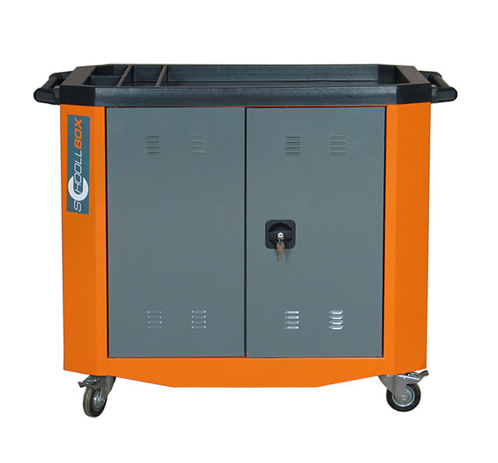 Представляет собой металлический шкаф, оборудованный передвижными поворотными колесами (2 из которых со стопором). Внутри корпуса расположены 2 полки, которые разделены сетчатыми перегородками для хранения ноутбуков. Максимальное количество размещаемой техники — 30 шт (по 15 на каждой полке).