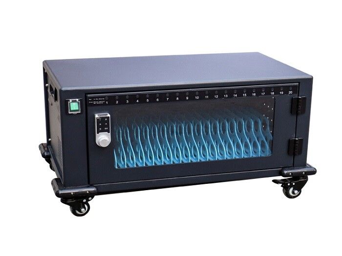 Легкая конструкция для безопасного хранения планшетов убережет лицевую поверхность устройства от повреждения. Тележка стоит на 4-х колесах со стопорным механизмом. Противоударный корпус запирается на кодовый замок. В крупных отсеках разместятся планшеты любых размеров.