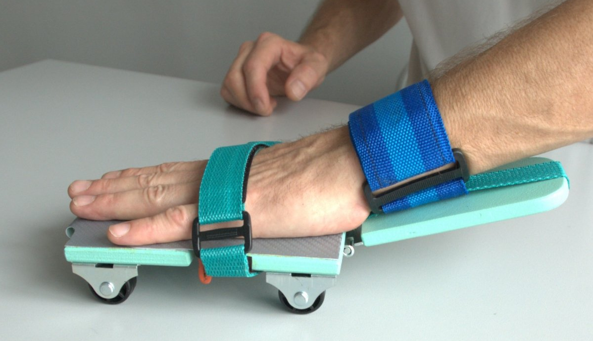 Ладонь и запястье закрепляются на рабочей поверхности резинками на липучках. Ребенок перемещает тележку по ровной горизонтальной поверхности одной или 2-мя руками.