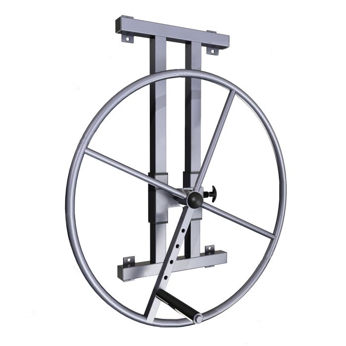 Конструкция крепится к полу или стене. Металлическое колесо дополняется ручкой, которая выдвигается, определяя диаметр вращения. Дошкольники берутся за эргономичную рукоятку и приводят в действие движущийся элемент.