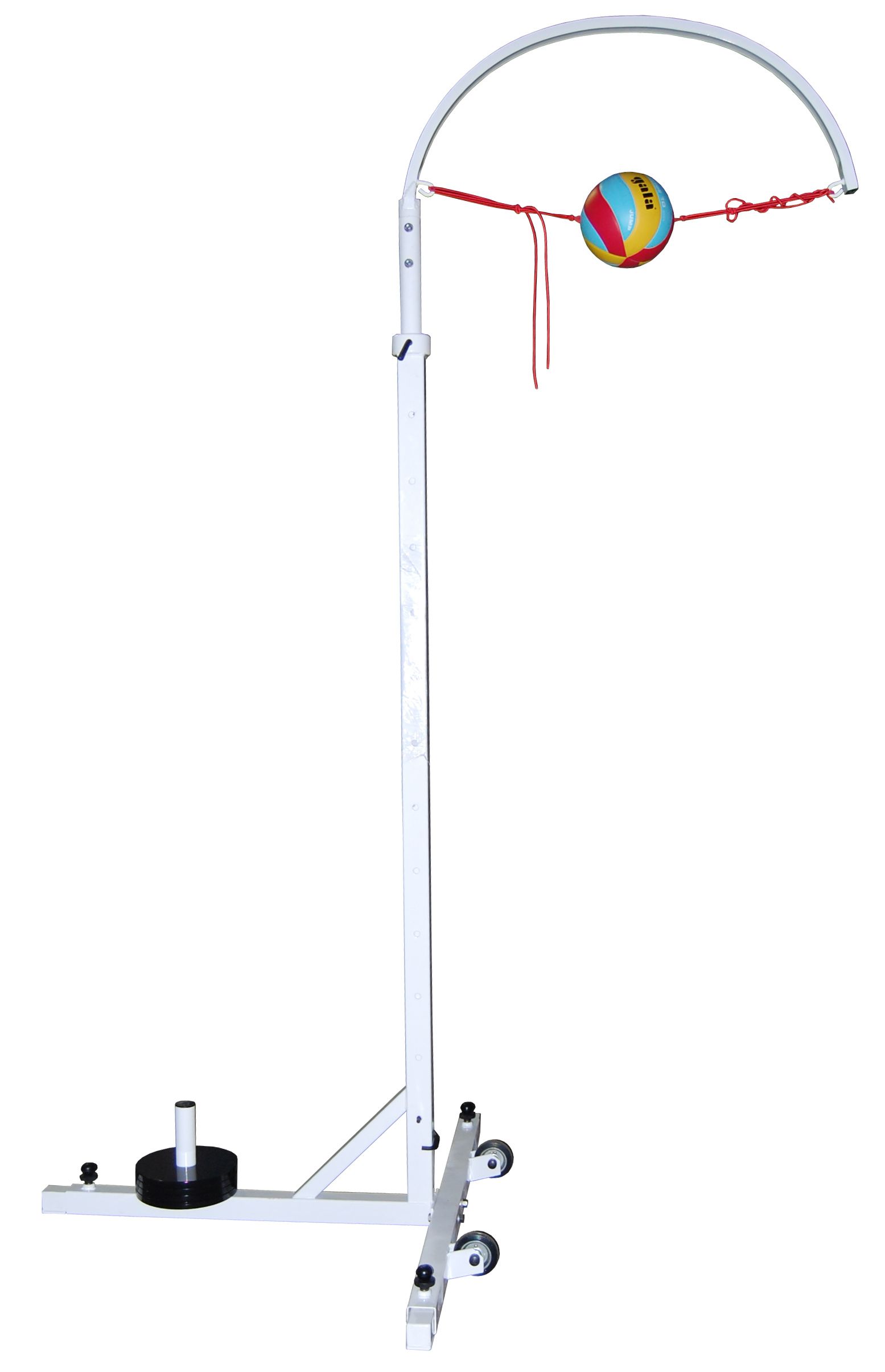 Волейбольная стойка устанавливается в школьном спортзале. Основание представлено угловым элементом. Ширина и высота конструкции регулируется. Между концами дугообразного элемента конструкции закрепляется волейбольный мяч на веревках. Тренажер помогает отработать навык подачи для игры в волейбол.