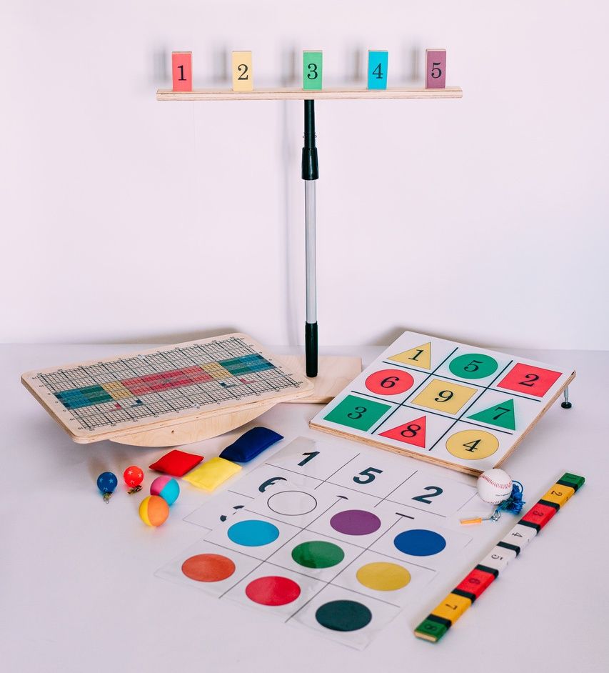 - 2 сменные поверхности для упражнений с мишенью (магнитная основа, цветные цифры и круги);