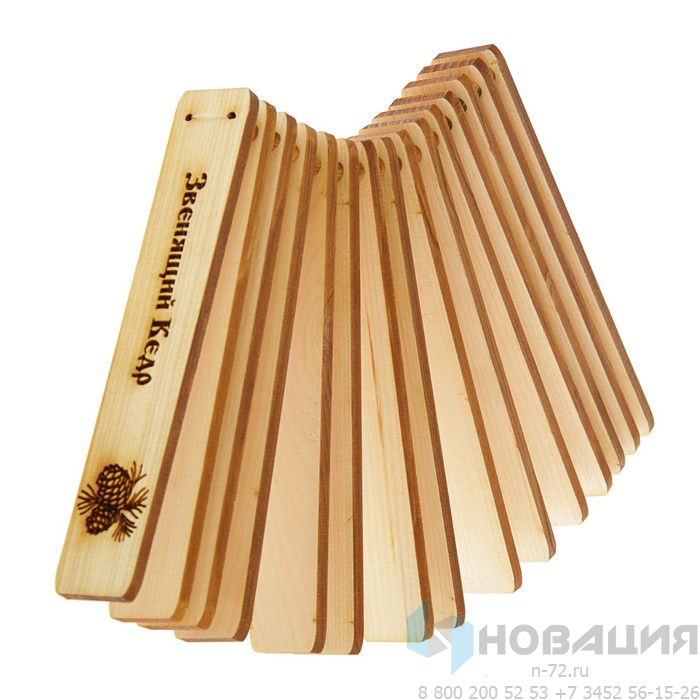 Музыкальный инструмент из кедра издает при встряхивании трескучий звук. Громкость регулируется сжатием пластин. Во время музыкальных занятий ребенок тренирует слух и развивает мелкую моторику. Отшлифованное изделие не оставляет заноз.