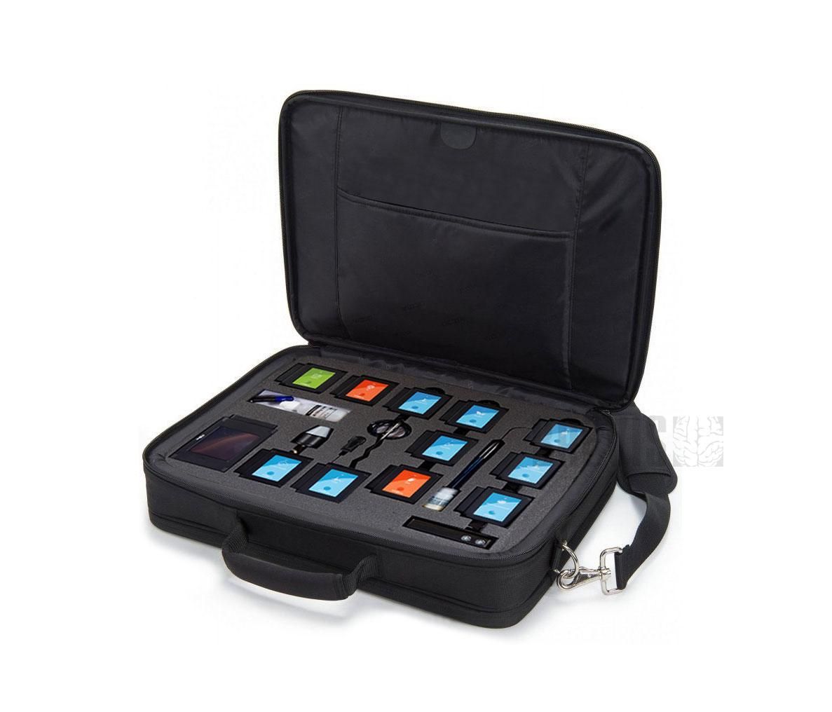 Комплектующие упакованы в кейс. Провода для соединения не требуются. Мобильное оборудование готово к применению в любых условиях (например, без компьютера).
