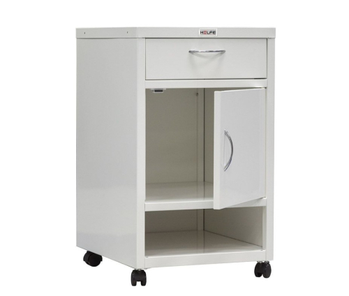 Тумба оснащена 4 колесами, 2 из которых имеют тормоза. В верхней части располагается ящик на телескопических направляющих. Полка рассчитана на нагрузку до 15 кг, ящик - до 7 кг.