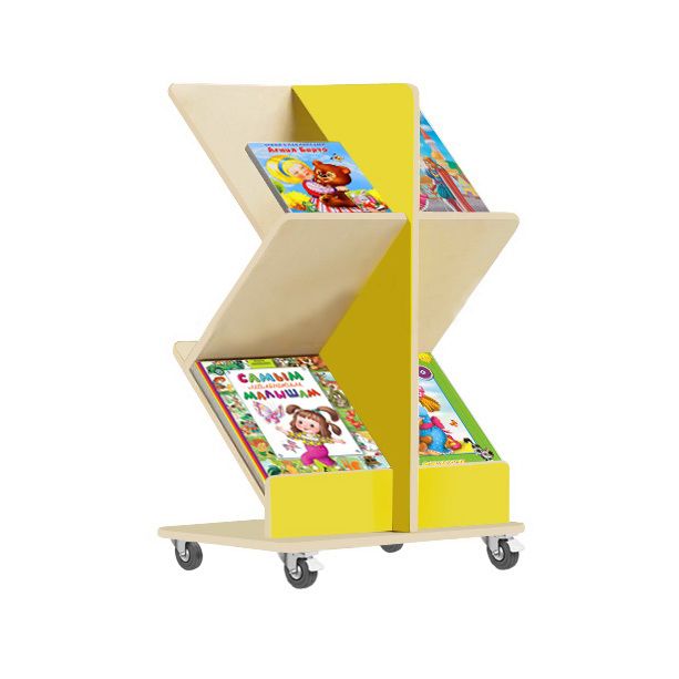 Тумба с 4-мя поворотными колесами подходит для хранения пособий, брошюр, детских игрушек и рисунков. Состоит из 2-х наклонных полок, каждая делится пополам вертикальной перегородкой. Боковых стенок нет. Углы панелей скруглены, поверхности отшлифованы. Торцы облицованы кромкой.