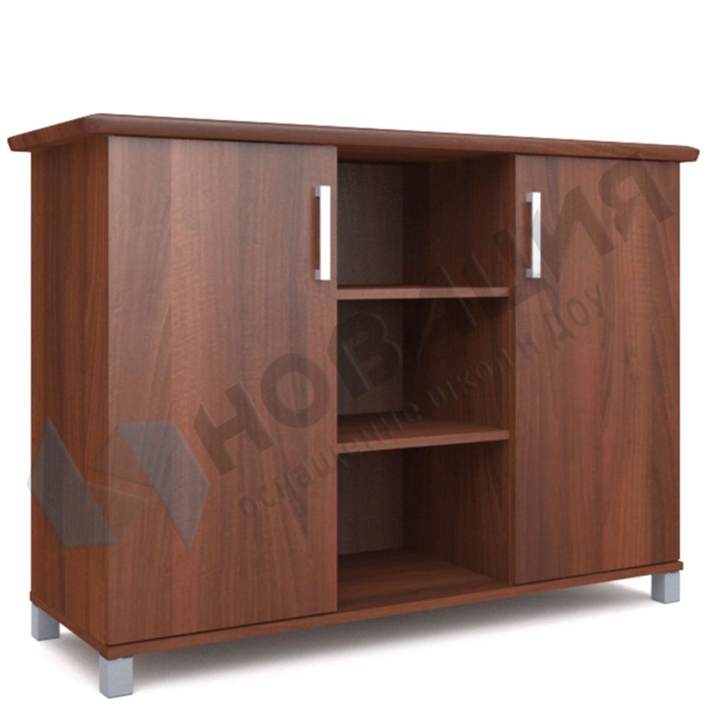 Изделие представляет собой тумбу на ножках, с открытыми полками и двумя распашными дверцами по бокам. Подходит для кабинета руководителя в школе, детском саду и других учреждениях. Дверцы оснащены всей необходимой фурнитурой. Прямоугольный топ может служить в качестве дополнительной поверхности для хранения бумаг и канцелярии, а также для размещения цветочных горшков, выставочного или раздаточного материала.