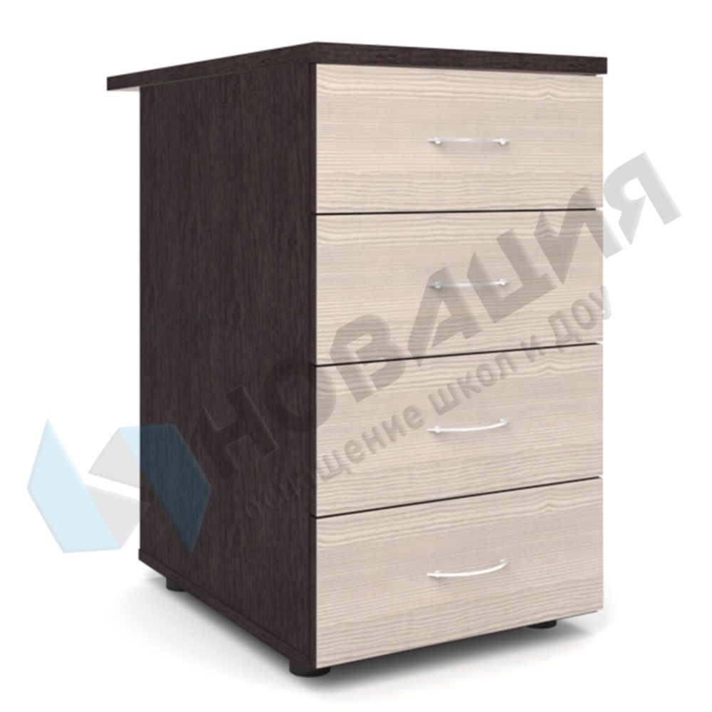 Тумба приставная размещается в кабинетах ДОУ, школ, прочих муниципальных учреждений. Ширина модели позволяет использовать ее в качестве дополнения к компьютерному столу. 4 выдвижных ящика с мебельными ручками помогут бережно сохранить документацию и канцелярию.