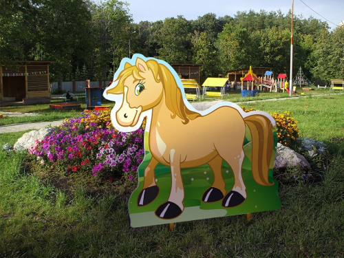 Разноцветная фигура лошади устанавливается в грунт при помощи металлических стоек и крепежа (входят в комплект). На поверхность нанесена специальная пленка, защищающая от выцветания.