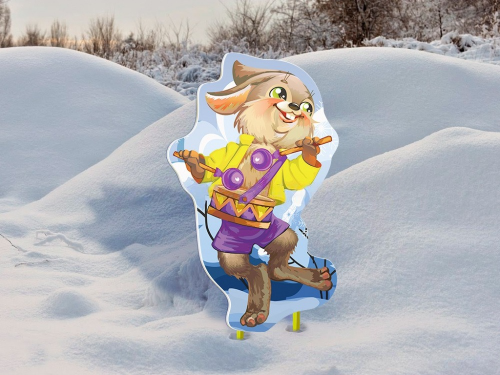 Полноцветная фигура выполнена в виде зайца на фоне зимнего пейзажа. На поверхность нанесена защитная пленка. Монтируется в грунт посредством металлических стоек и крепежа (входят в комплект).