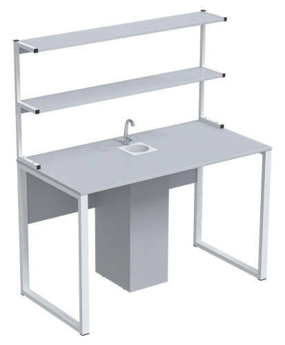Лабораторный химический верстак — это двухместный стационарный стол с металлической рамой и влагостойкой столешницей из ЛДСП, идеально подходящий для проведения химических опытов. Конструкция включает встроенную раковину с краном, надстройку с двумя полками для хранения и продуманную систему скрытия коммуникаций за водоразборной колонкой с замком.