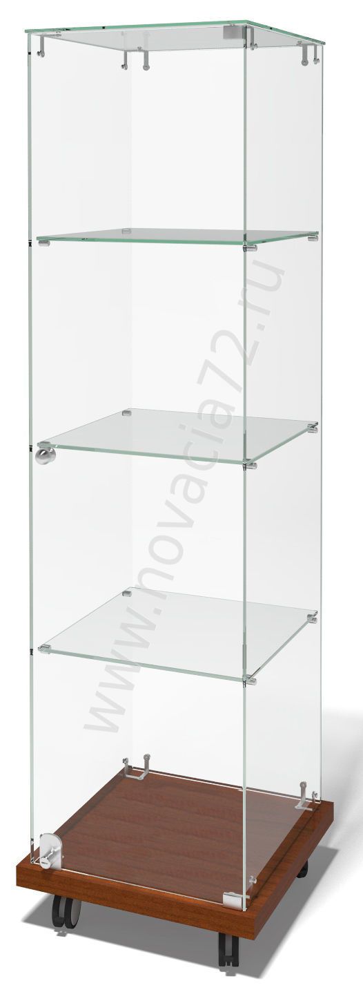У витрины квадратное основание из ЛДСП, корпус, 3 полки и дверца с замком из стекла марки М1.