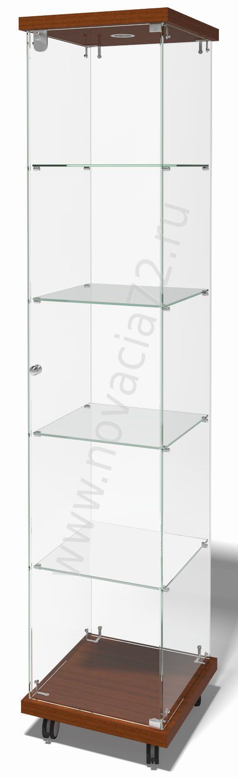 Пенал с фризом оснащен стеклянными полками и дверцей с замком, а так же точечным светильником. Используется стекло марки М1. Фриз и основание выполнены из ЛДСП.