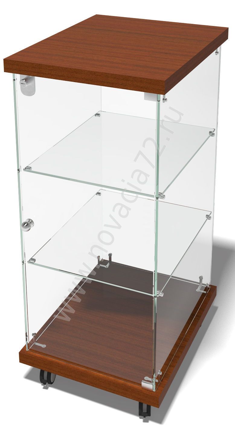 Демонстрационный прилавок представлен крышкой и основанием из ЛДСП. Стенки, дверца и 2 полки изготовлены из стекла марки М1.