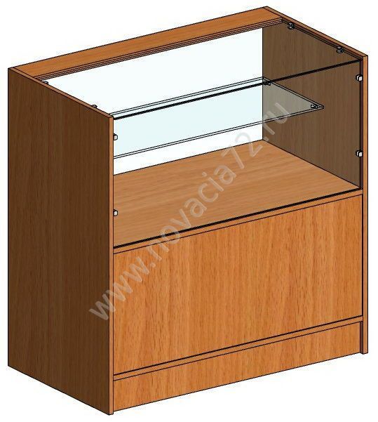 Нижняя часть служит для хранения предметов. Отделение без задней стенки скрыто за глухим фасадом. Выше расположен отсек с 1 полкой для выставок. В нем можно размещать образцы пособий, поделки, медали. Фасад и полка, глубиной 300 мм, стеклянные. Максимальная распределенная нагрузка на полку 7 кг.